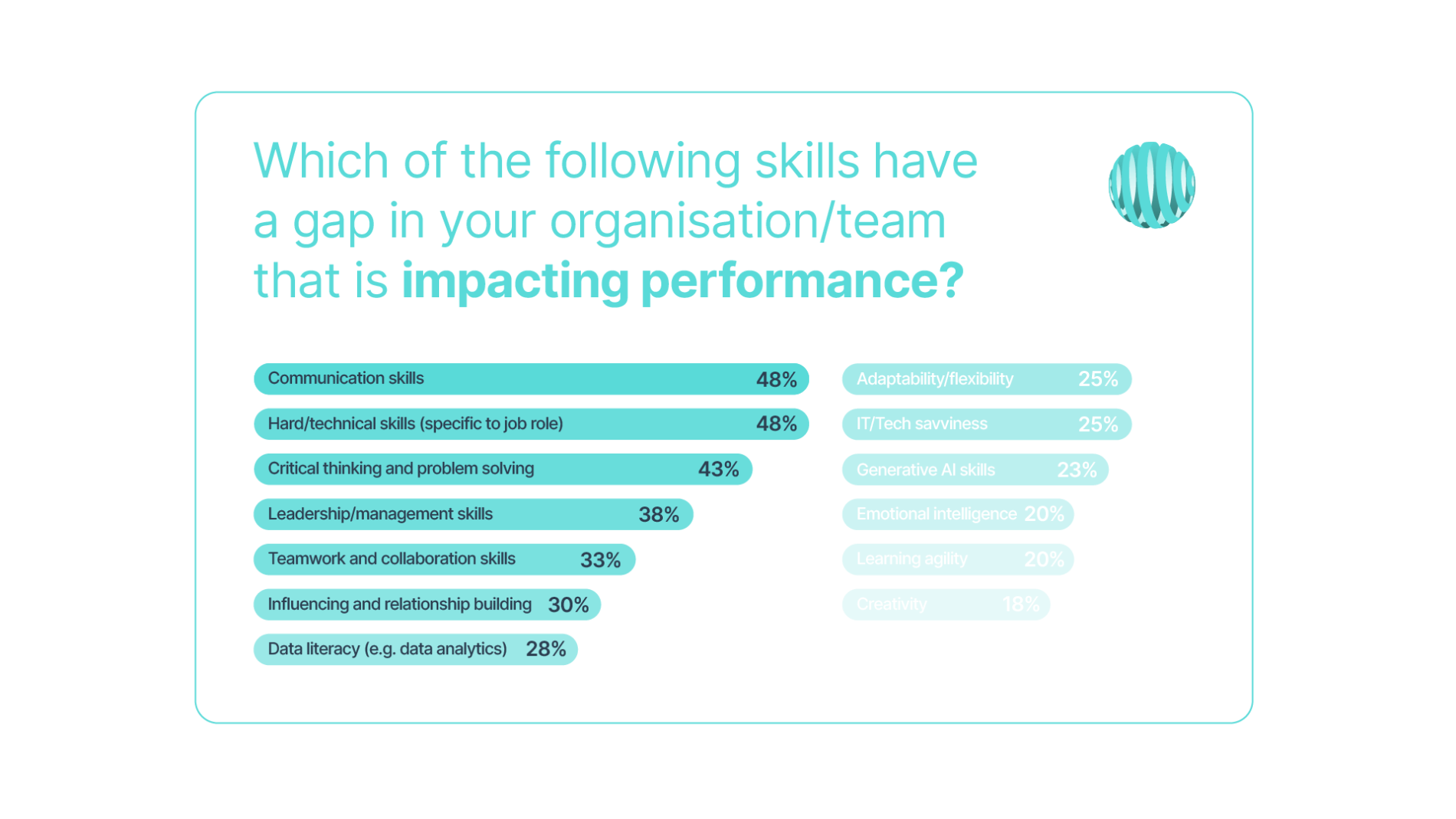 In fact, most organisations (48%) report that hard/technical skills specific to a job role have a gap in their teams. Data literacy, gen AI, and tech-savviness are among the other top missing skills.
