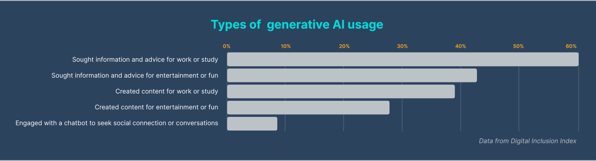 A whopping majority (60.5%) use generative AI to seek advice for work or study, followed by 42.8% who ask for information on entertainment and fun.